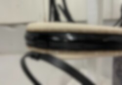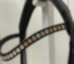 This is a black München Feel Good round-sewn bridle with the slightly wider, well-padded neck piece, which is specifically named Feel Good because it has a softer setting against the horse's neck. The noseband on this round-sewn bridle is 5 cm wide in the Comfort XS model, which means that the noseband is narrower at the sides where the horse has the least space at the bit, the closure of the noseband is pull-back. The noseband is in patent leather and has Swarovski fineline decoration, is softly padded with a light silky color that is exceptionally beautiful against a light fux or palomino.