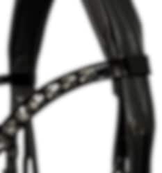 This is an exceptionally elegant black bridle. The noseband on this round-stitched bridle is 5 cm wide in the Comfort XS model. The noseband features black patent leather on the nose bridge with fine-line piping in jet-platin.