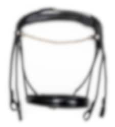 An anatomical and round sewn double bridle with a unique headpiece that prevents pressure and muscle damage in the horse's neck muscles.