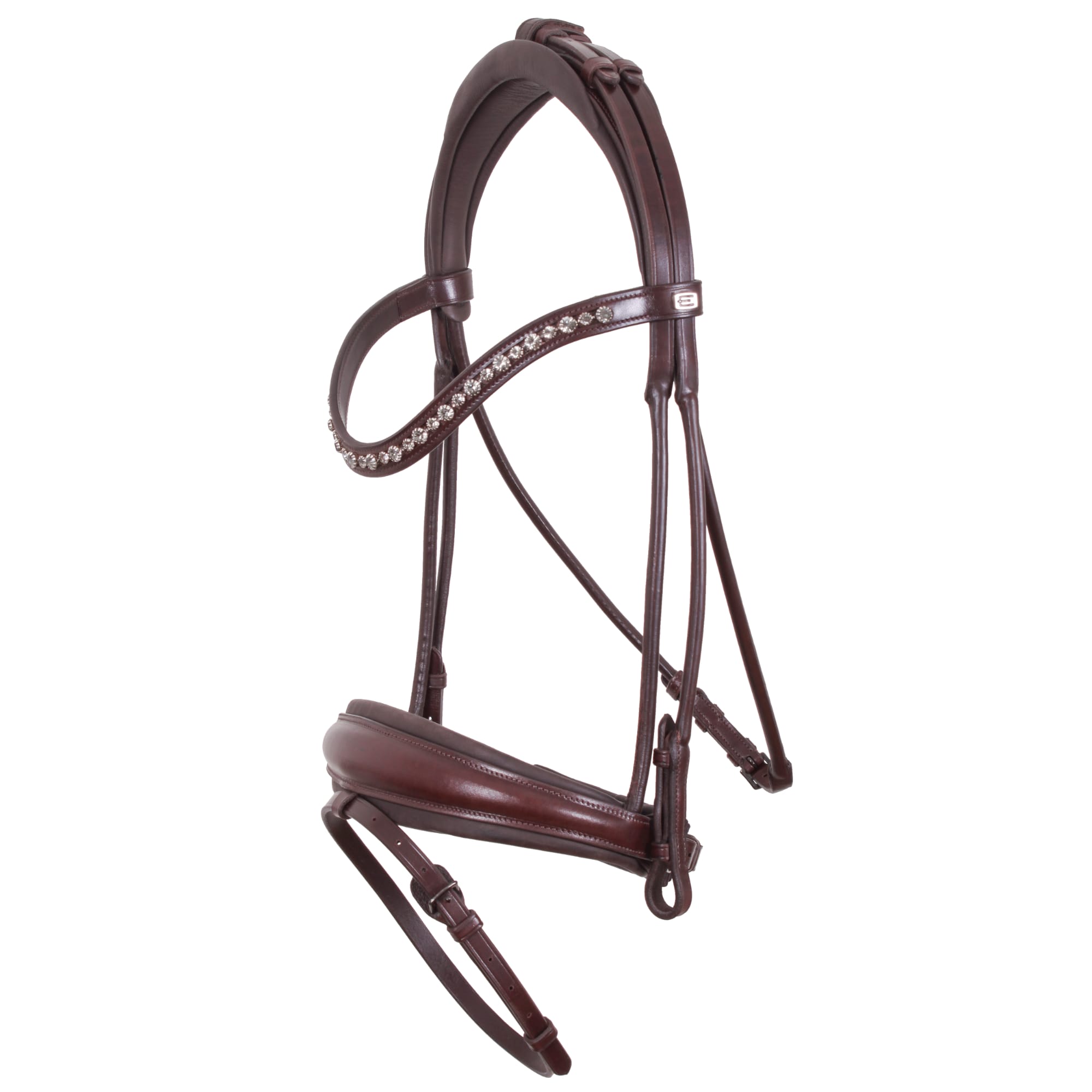The Hamilton dressage bridle features a stylish curved browband, decorated with alternating large and small grey Swarovski crystals. The bridle also includes dark buckles for a discreet finish, and the E-logo on the browband adds a modern detail.