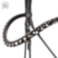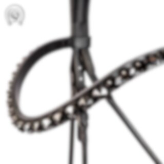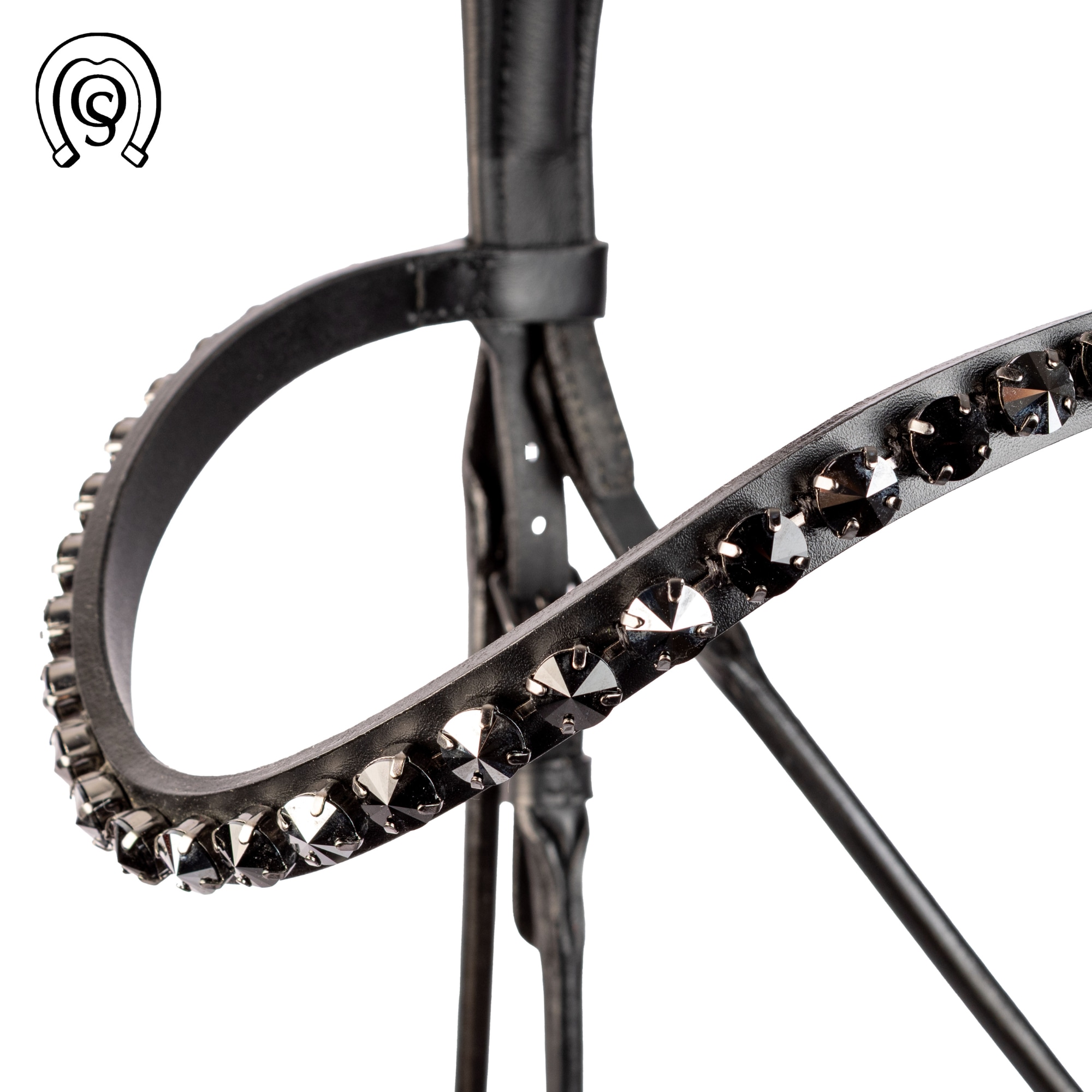 The Genua bridle is made of black round-sewn leather with tone-on-tone padding. The noseband features black patent leather, and the browband is a beautifully curved design adorned with 10 mm Swarovski Rivoli crystals, alternating in Jet and Jet Hematite.