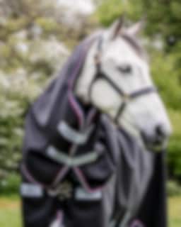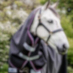 Horseware Rambo Supreme Hood 150 gr has the same fantastic 1680D durable and hard-wearing material that the entire Supreme Turnout Rug has, also color matches in navy blue with multicolored edging.