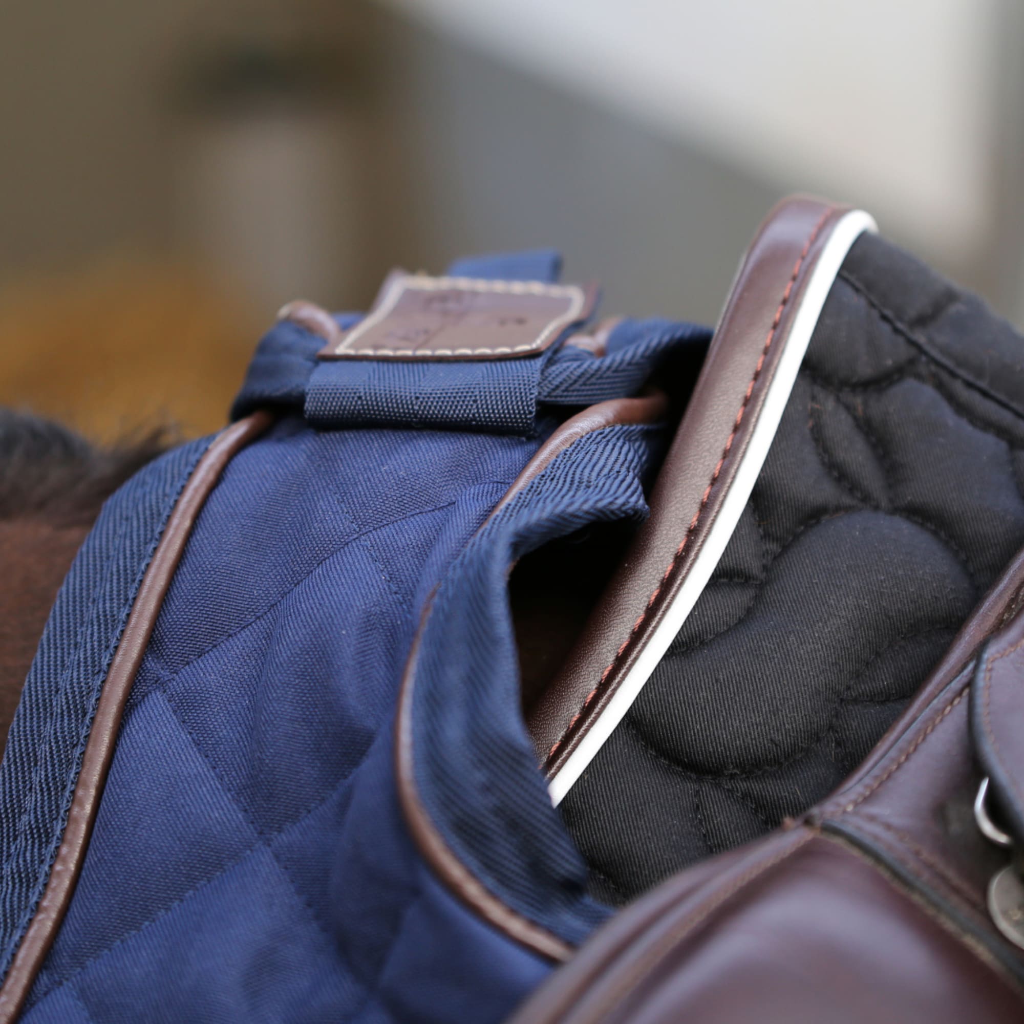 The rug attaches easily in front of the saddle with a strong Velcro fastening and is kept in place with a tail strap. The classic cut covers the loins and back without interfering with leg aids. The elegant design with diamond quilting, faux leather details and the Kentucky logo gives an exclusive look suitable for both training and competition.