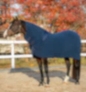 A lovely navy blue antistatic fleece rug for horse with a neat quilted collar and fleece hood!