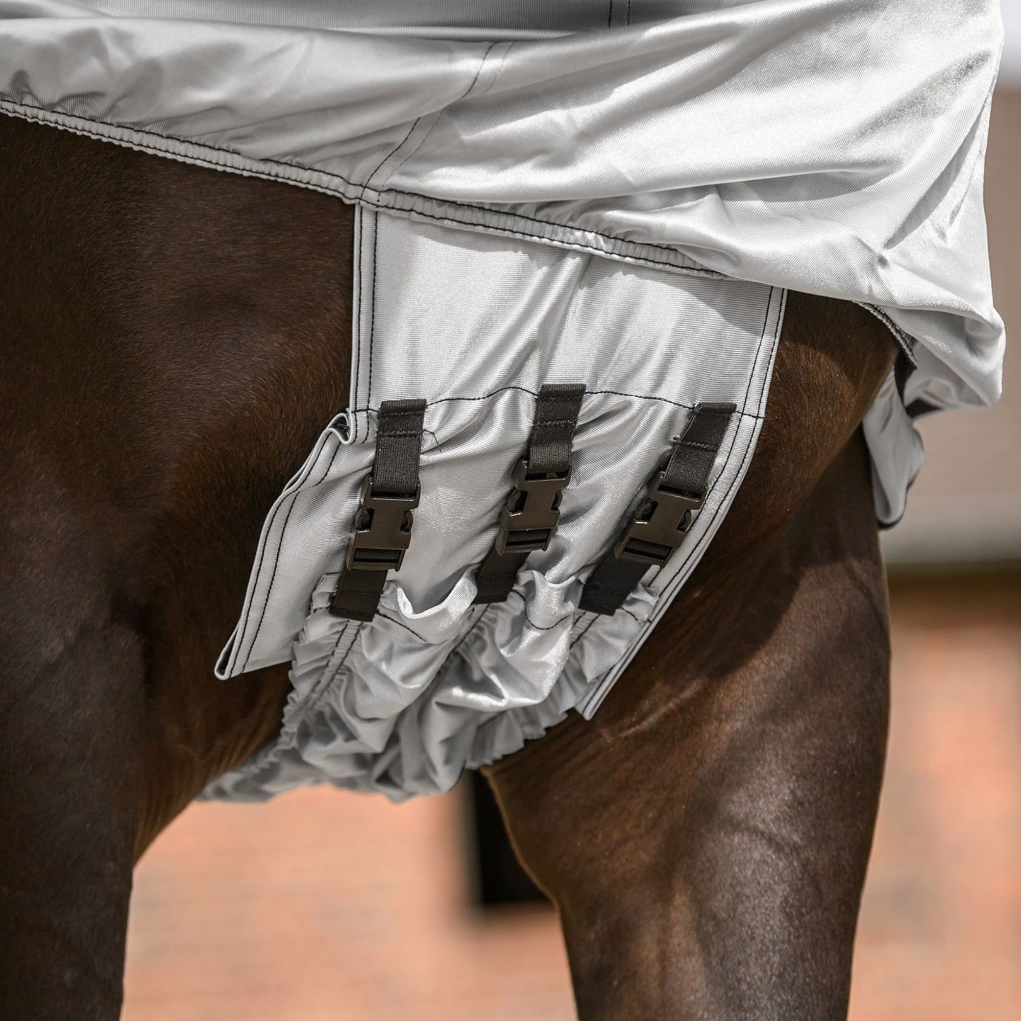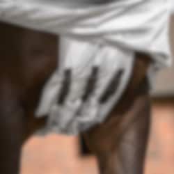 The fixed neck section and wide belly flap provide excellent coverage over the areas where sweet itch most commonly occurs. Elastic inserts at the shoulder and at the base of the neck allow good freedom of movement and help the rug sit comfortably even when the horse is moving in the field.