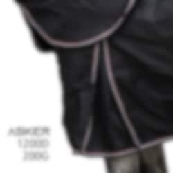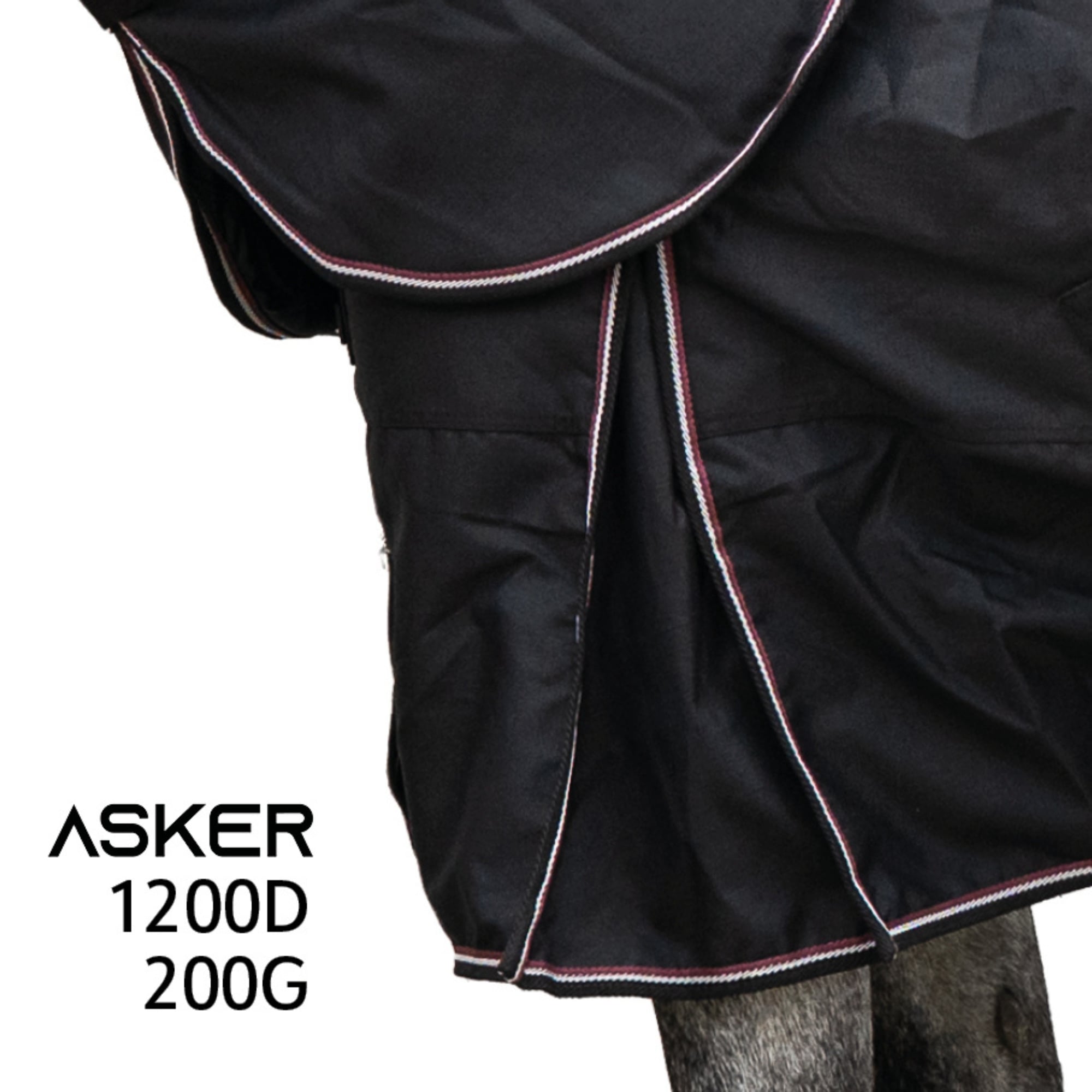 Asker TO Plus 1200D 200g in black is a durable and waterproof turnout rug that comes with a separate neck cover. Made from extra strong 1200 denier fabric, it offers excellent breathability and a comfortable fit.