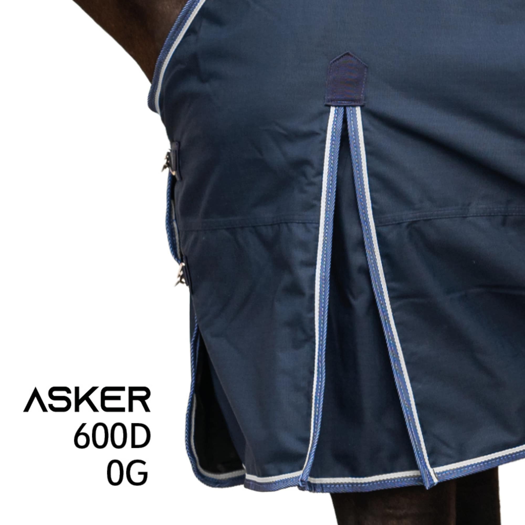 Asker Turn Out Rug SN 0g in navy is a waterproof turnout rug without a neck. The rug offers good breathability, a comfortable fit, and can be complemented with a separate neck cover.