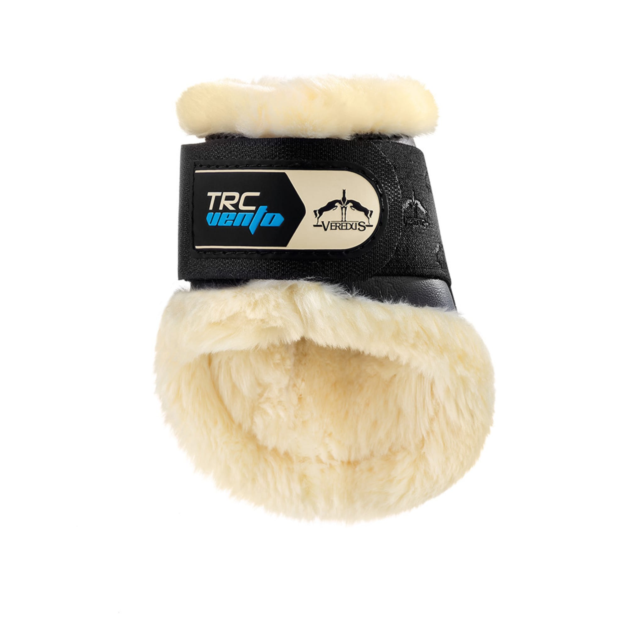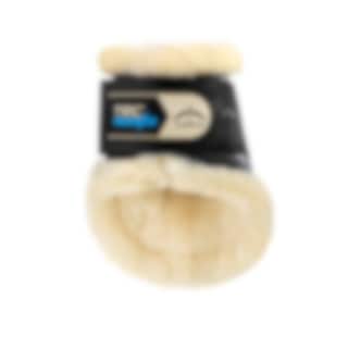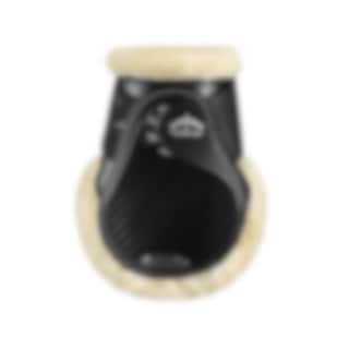 Black rear fetlock boots with a ventilation system and soft synthetic sheepskin lining.