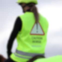 Stay safe and visible with this reflective vest featuring a clear warning triangle and printed text on the back. The vest is designed with a practical front zipper for easy use and secure fit. Ideal for riders, drivers, or anyone needing extra visibility in low-light conditions.