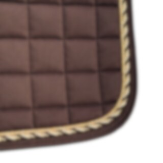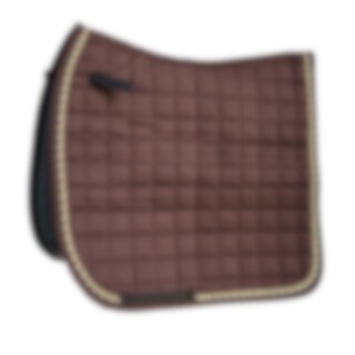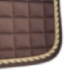 This dressage saddle pad is in a beautiful brown color with large quilting and two pipings, one in gold and one in brown/gold glitter/white. The edging that runs along the entire saddle pad is navy.