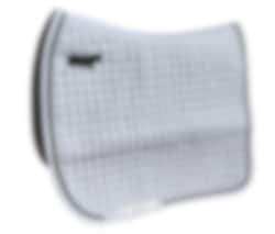This dressage saddle pad is in a beautiful white color with large quilting and two pipings, one in black and one in black/silver glitter/white.