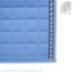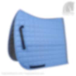 The dressage saddle pad is quilted with large squares (5x5cm) and has three pipings, one in navy, one in navy/silver/white and one navy followed by a edge band toned with the saddle pad.