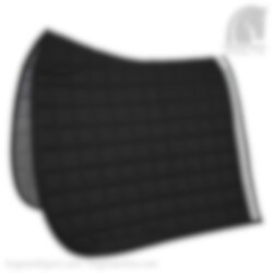 The dressage saddle pad is quilted with large squares (5x5cm) and has three pieces of pipings in pearl, black / white / silver and pearl followed by an edge band that is tone-in-tone with the saddle pad.