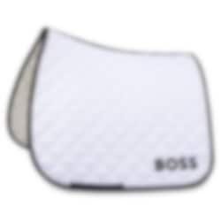 Dressage Saddle Pad Signature from Boss Equestrian is a high-quality dressage saddle pad made from moisture-wicking fleece with logo embroidery and signature-striped edging for optimal saddle position and style.
