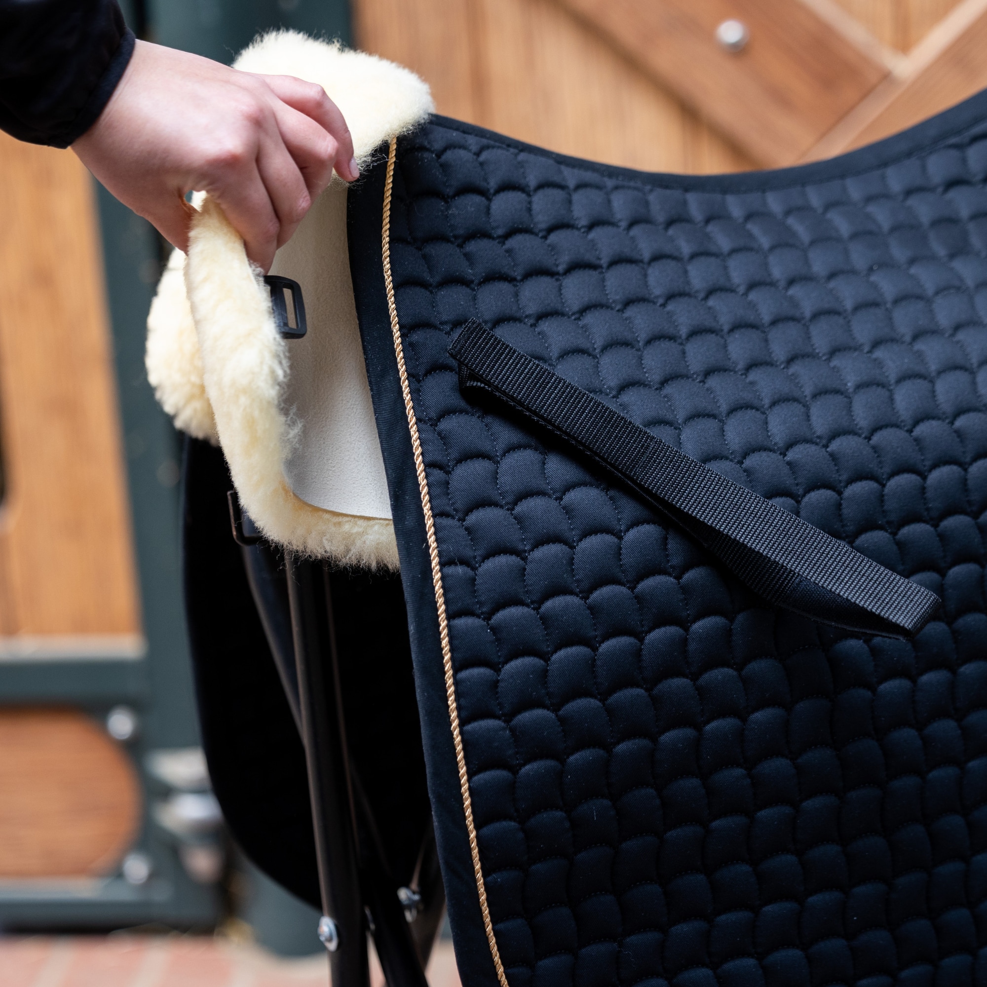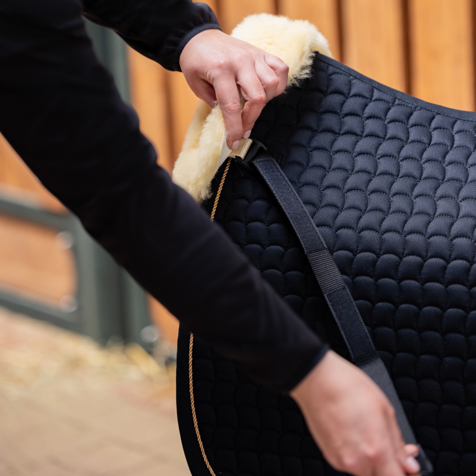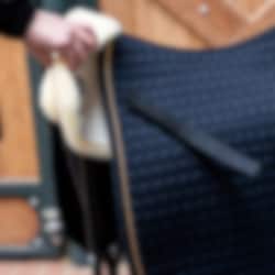 Eskadron’s sheepskin pad attaches to the saddle pad straps and provides a soft layer of sheepskin closest to the horse’s back. An easy way to combine your regular saddle pad with the benefits of sheepskin.