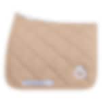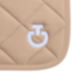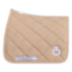 The Diamond Quilted Jersey dressage saddle pad features a warm sand beige tone and is finished with a white CT logo and a white spine strip along the back, also featuring the Cavalleria Toscana logo.