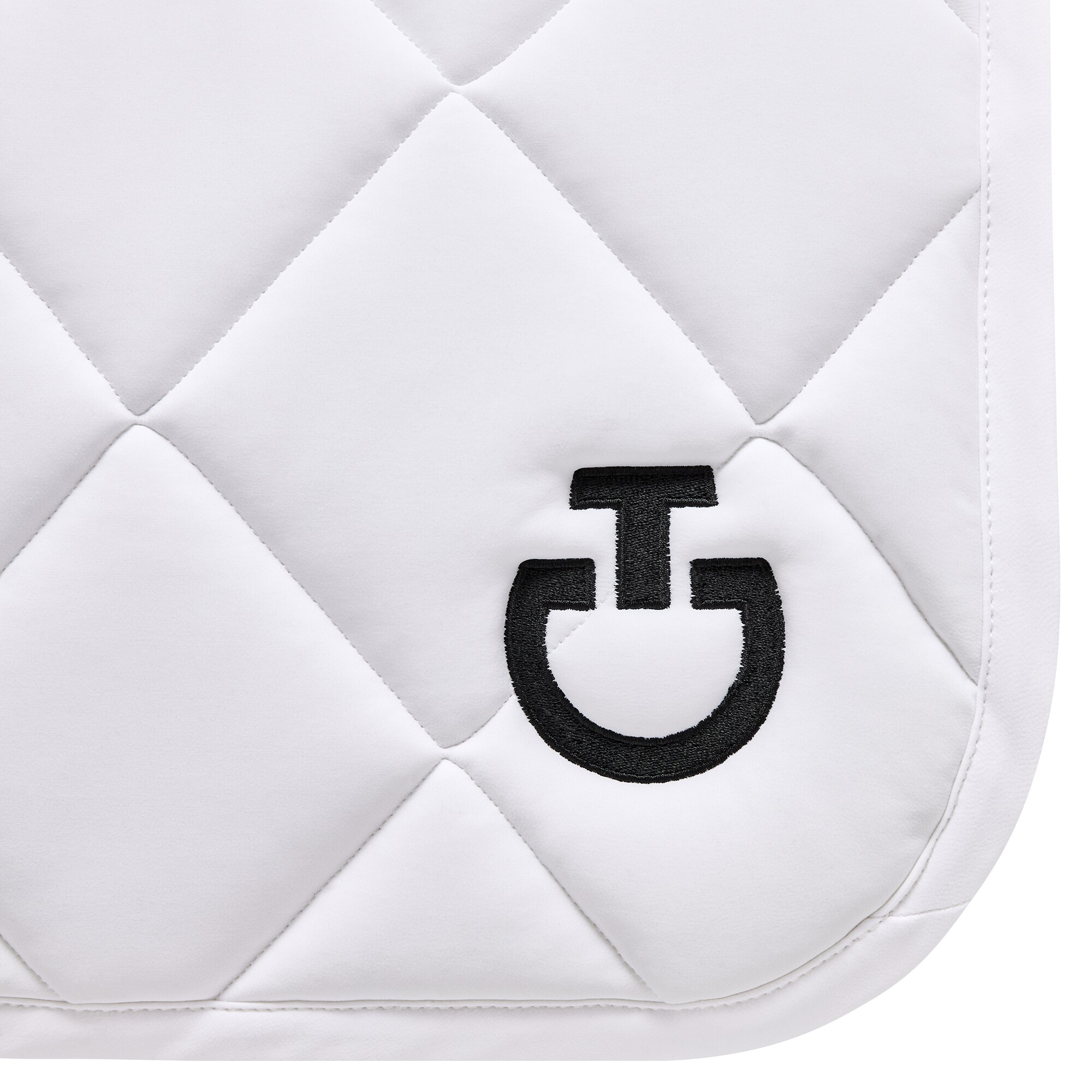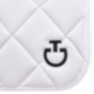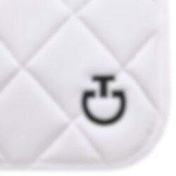 The Diamond Quilted Jersey Dressage Saddle Pad comes in white and features a black CT logo and a white channel along the back with the Cavalleria Toscana logo as well.