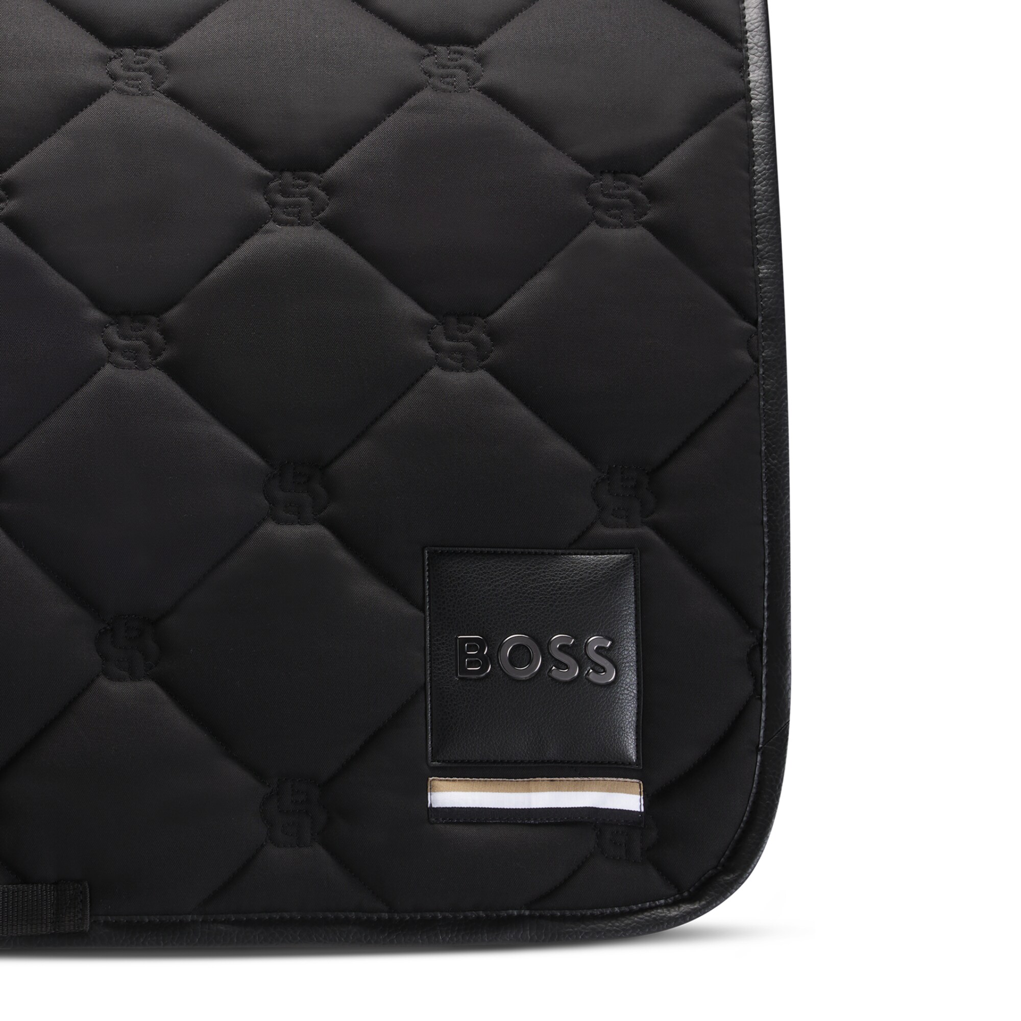 Elegant and refined dressage saddle pad from BOSS Equestrian, made from high-quality glossy fabric. The pad features subtle quilting, a classic leather patch with signature stripes, and a fine imitation leather trim.