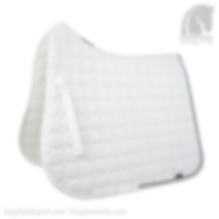 A beautiful White dressage saddle pad embellished with a clear diamond/black trim, white/black piping and white edging.