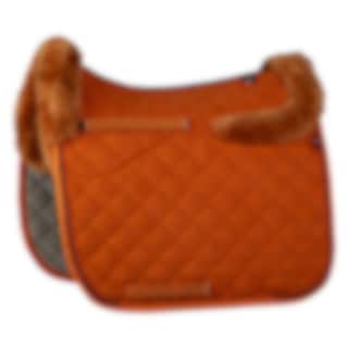 This is a top-quality sheepskin saddle pad with an integrated sheepskin pad inside. Its channels run along each side of the horse’s spine as well as around the front and back arches of the saddle. The sheepskin helps distribute pressure and wick away moisture from the horse. The top of the pad is made of beautiful cord.
