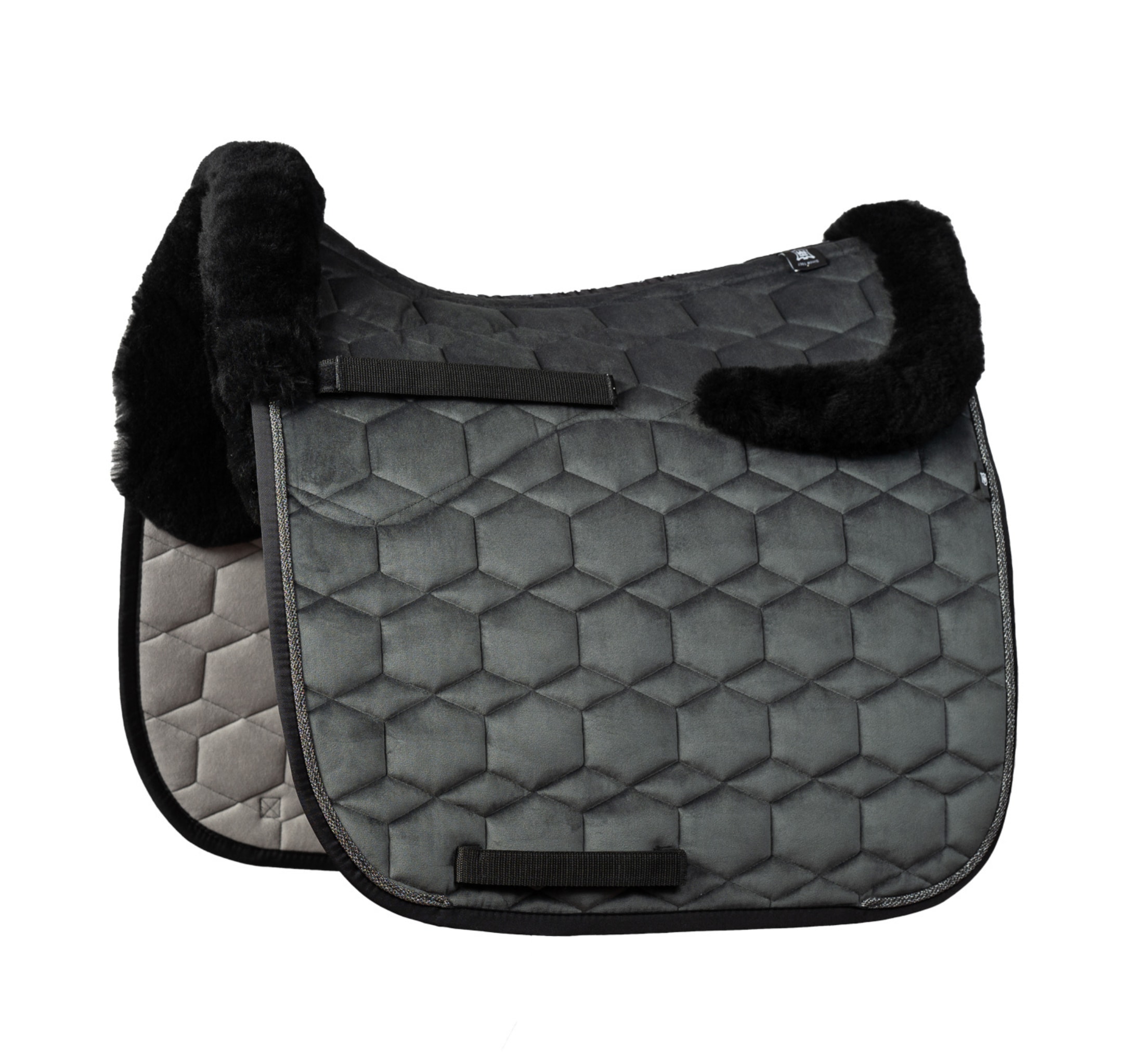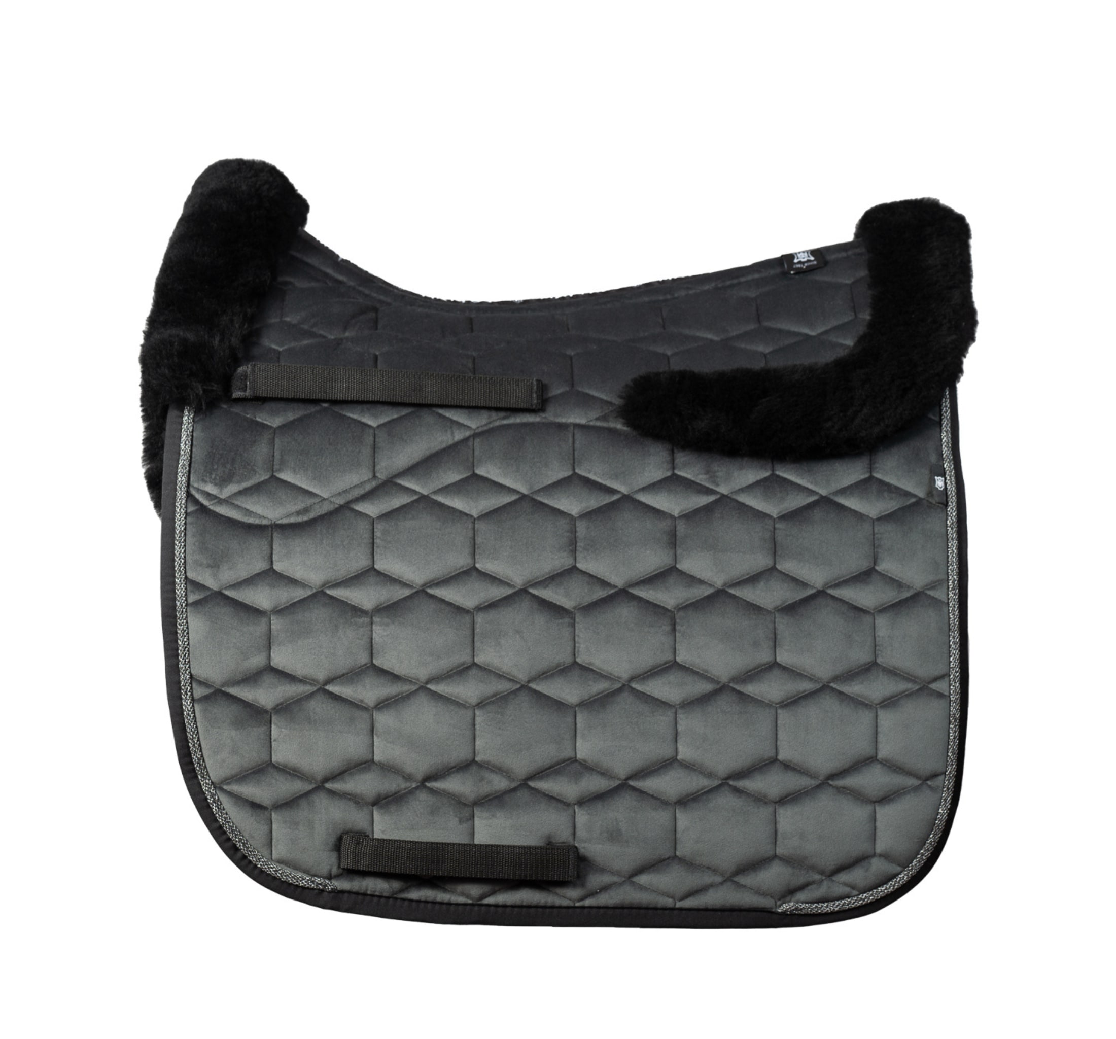The sheepskin saddle pad comes in graphite with black sheepskin and two beautiful piping details along the edges.