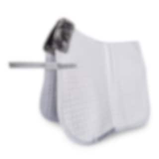 The dressage saddle pad follows the Show-Line series with the eye-catching contrasting piping in grey that breaks nicely against the white color of the saddle pad.