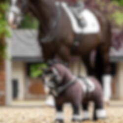 This miniature double bridle is crafted from genuine leather by the same skilled leatherworkers who make LeMieux double bridles and other fine leather equipment. With fully functional buckles, you can easily adjust the fit to sit perfectly on your Toy Pony.
