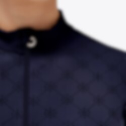Lightweight Fleece Riding Shirt is both very stylish and very comfortable to wear. It is in a dark navy color with a beautiful tone-on-tone pattern on the front and back. The arms and sides are unpatterned and the front has a zipper at the collar.