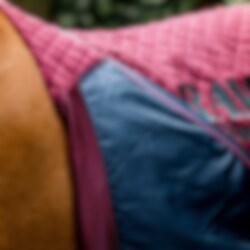 For a secure fit, the rug fastens at the front with a sleek leather buckle and is secured with two cross surcingles under the belly. An extra-wide tail flap protects the tail from rubbing and adds extra comfort during travel.