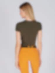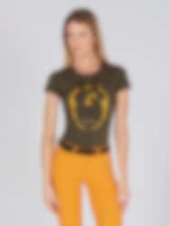 This t-shirt is in a nice olive color and has a print of a horse's head in black, with yellow details around.