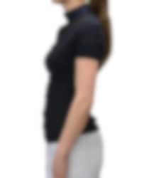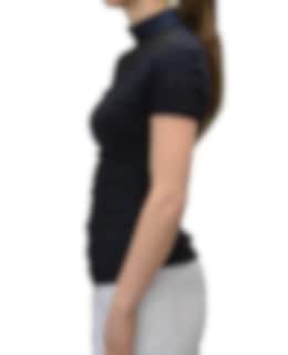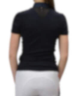 The shirt is dark blue with black mesh around the collar, over the shoulders and neck. At the back there is also a short zipper. On the front of the polo collar is a stylish vestrum logo. There is also a discreet logo on the left arm.