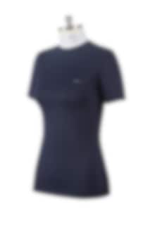 This is a competition shirt with short sleeve from italian Animo. The competition shirt has a nice navy color and a white collar with glittering stones in Animo around the collar. The competition top also has Animo's discreet logo in stones on the chest.