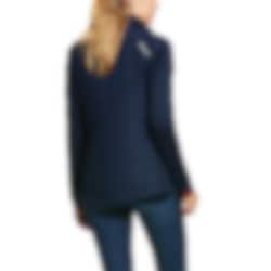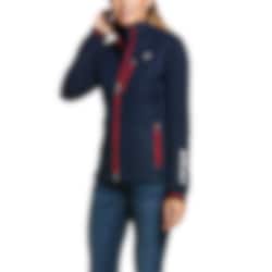 Color Navy blue with nice red details and Ariat text along one sleeve and Ariat logo on the chest.